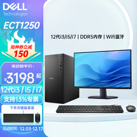 戴尔(DELL)ECT125012代酷睿高性能台式电脑主机商用家用主机灵越整机全套成就3030升级大机箱+23.8英寸显示器i3-121008G内存512G固态定制