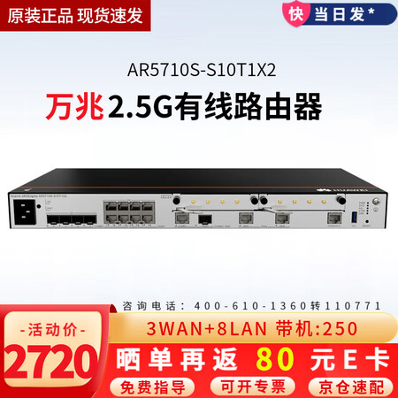 华为(HUAWEI)坤灵AR5710S系列企业级核心路由器2.5G电口万兆光口8口千兆有线高速宽带路由SD-WAN管理带机250台AR5710S-S10T1X23WAN+8LAN中小型企业总部或分支的网关设备