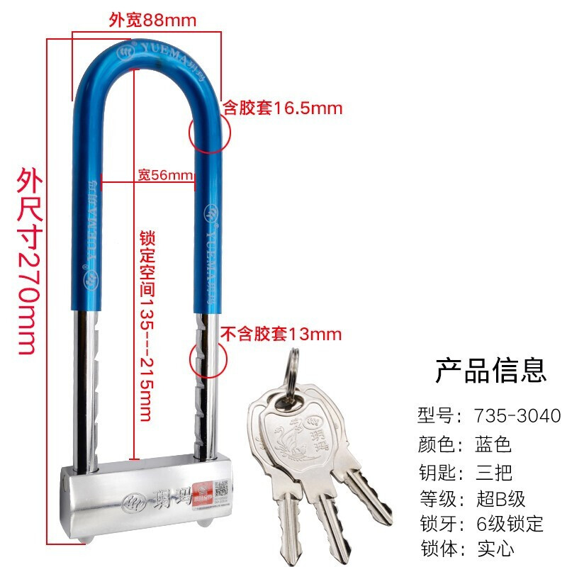 玥玛 735-3040 双开门抗剪U型锁 270*88mm 蓝色 计价单位:把